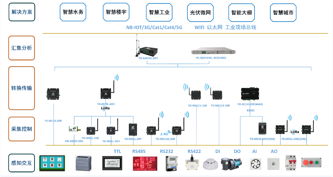 云涌科技智慧物聯(lián)網(wǎng)產(chǎn)品系列覆蓋采集控制、數(shù)據(jù)傳輸、數(shù)據(jù)分析等應(yīng)用場(chǎng)景,同時(shí)支持以太網(wǎng)、RS485、RS232、RS422等現(xiàn)場(chǎng)總線,支持模擬量和數(shù)字量的輸入和輸出,也支持4G CAT1、4G CAT4、LoRa、WIFI等無線傳輸方式,能滿足現(xiàn)場(chǎng)復(fù)雜的通訊需求。