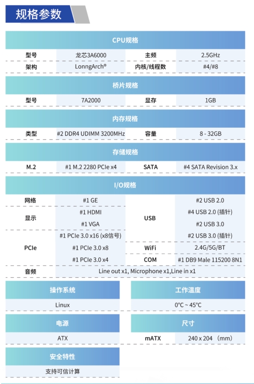 由云涌科技推出的基于3A6000的系列產(chǎn)品,采用4核處理器構(gòu)建,主頻2.5GHzo,搭配7A2000橋片,1GB獨(dú)立顯存,支持2路UDIMM3200DDR4內(nèi)存條,支持M.2接口,可作為小容量固態(tài)系統(tǒng)盤使用,應(yīng)用于家用娛樂(lè)、商務(wù)辦公等場(chǎng)景。
