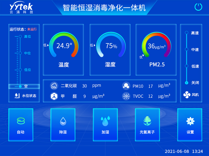 ? ? ? 此外,云涌智能恒濕消毒凈化一體機(jī)還具備智能化、人性化、直觀化的運(yùn)行方式及操作體驗(yàn),運(yùn)用微電腦智能控制技術(shù),全中文液晶觸控屏,功能模塊化設(shè)計(jì)等,搭配遠(yuǎn)程監(jiān)控系統(tǒng),實(shí)時(shí)智慧感知分析預(yù)制故障;同時(shí),設(shè)備自身配有大容量的內(nèi)置雙層水箱,實(shí)現(xiàn)雙重防漏保護(hù),結(jié)合配備的缺水、水滿、溢水漏水報(bào)警系統(tǒng),用戶可通過人工加水和自動(dòng)加水兩種可選方式,使整個(gè)設(shè)備在使用過程中更加安全便捷。