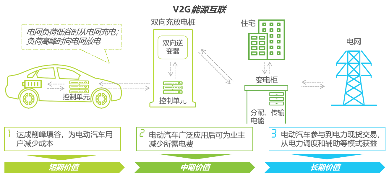 ?V2G模式試點(diǎn)正在進(jìn)行:V2G可達(dá)成車輛與電網(wǎng)之間的能源互聯(lián),實(shí)現(xiàn)儲(chǔ)能調(diào)峰、改善電能質(zhì)量、調(diào)整用電負(fù)荷等服務(wù),將成為未來的長期發(fā)展方向。