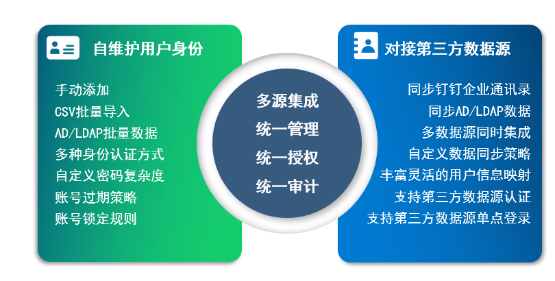 云涌零信任安全管理平臺(tái)既支持主流企業(yè)通訊錄系統(tǒng)的數(shù)據(jù)導(dǎo)入與同步,也支持自建用戶體系。實(shí)現(xiàn)了在一個(gè)平臺(tái)對(duì)企業(yè)人員、部門以及角色組的統(tǒng)一高效管理。同時(shí)系統(tǒng)提供多種用戶認(rèn)證方式,全方位滿足各種需求場(chǎng)景。