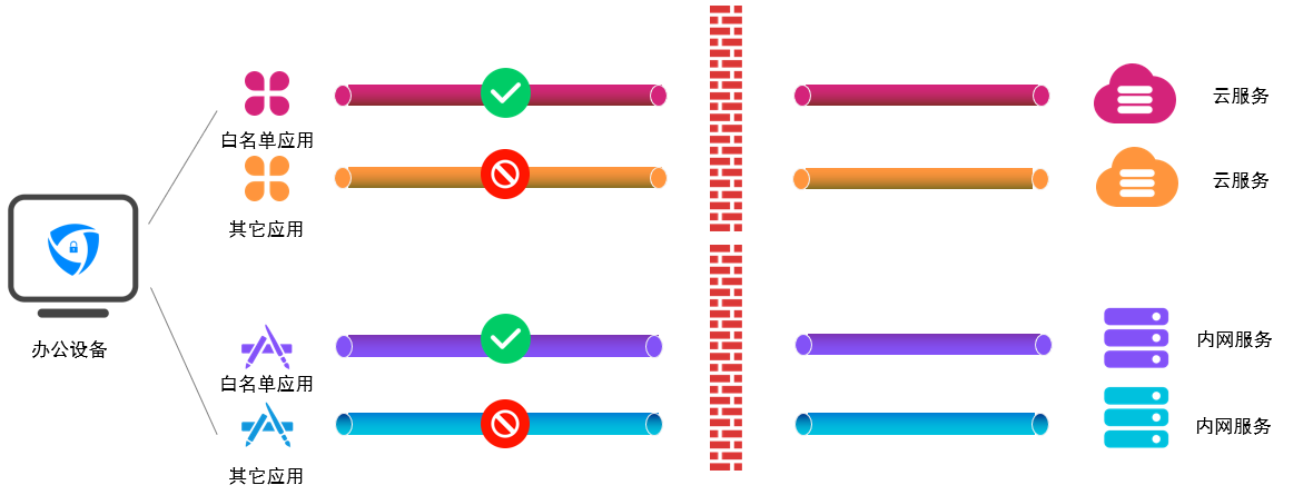 云涌零信任系統(tǒng)始終保證僅“合法”的本地應(yīng)用才能訪問內(nèi)網(wǎng)服務(wù)。只有經(jīng)過管理員授權(quán)的應(yīng)用進(jìn)程才可以通過TLS隧道傳輸數(shù)據(jù)。系統(tǒng)將應(yīng)用與服務(wù)綁定,提高服務(wù)訪問的安全性。