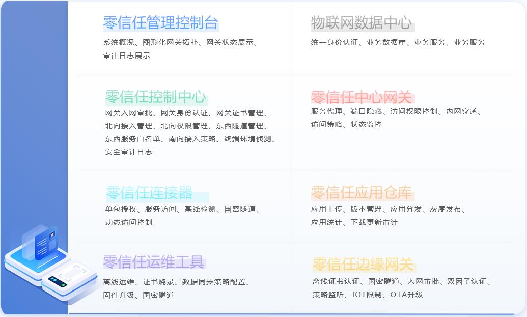 平臺由邊緣網(wǎng)關(guān)代理程序、網(wǎng)關(guān)離線運維工具、控制中心、接入網(wǎng)關(guān)、應用倉庫等模塊組合而成。產(chǎn)品核心功能包括邊緣網(wǎng)關(guān)身份認證、網(wǎng)關(guān)出入站訪問控制、網(wǎng)關(guān)間微隔離控制、邊緣應用管理、網(wǎng)關(guān)安全運維、網(wǎng)關(guān)數(shù)據(jù)存儲透明加解密等。同時平臺保護網(wǎng)關(guān)與北向數(shù)據(jù)中心的訪問安全,包括端口隱藏,通訊加密等。