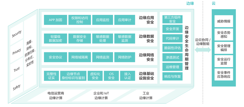 邊緣安全是邊緣計算的重要保障。邊緣安全涉及跨越云計算和邊緣計算縱深的安全防護體系,只有增強邊緣基礎設施、網(wǎng)絡、應用、數(shù)據(jù)識別和抵抗各種安全威脅的能力,才能為邊緣計算產(chǎn)業(yè)的發(fā)展構(gòu)建安全可信環(huán)境。邊緣安全的核心價值體現(xiàn)在可以提供可信的基礎設施:主要包括計算、網(wǎng)絡、存儲類的物理資源和虛擬資源。基礎設施是包含路徑、數(shù)據(jù)交互和處理模型的平臺面,可以應對鏡像篡改、DDoS 攻擊、非授權(quán)通信訪問、端口入侵等安全威脅。