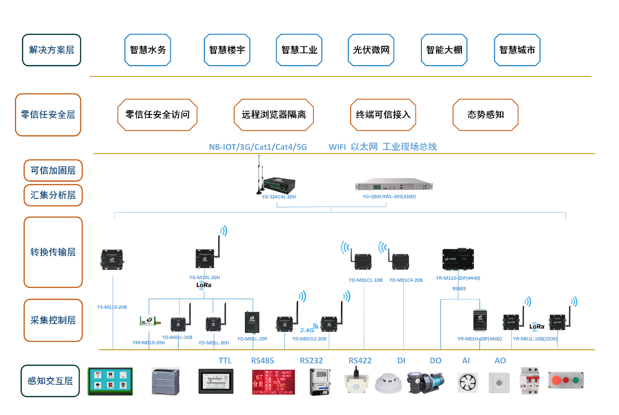 ? ? ? 在轉(zhuǎn)換傳輸層,智慧物聯(lián)設(shè)備支持LORA、4G、以太網(wǎng)、RS485等等多種通信方式的組網(wǎng)傳輸和轉(zhuǎn)換,有基礎(chǔ)型、增強型、工業(yè)級等等分類,做到了大部分場景的覆蓋,滿足復(fù)雜的應(yīng)用環(huán)境;