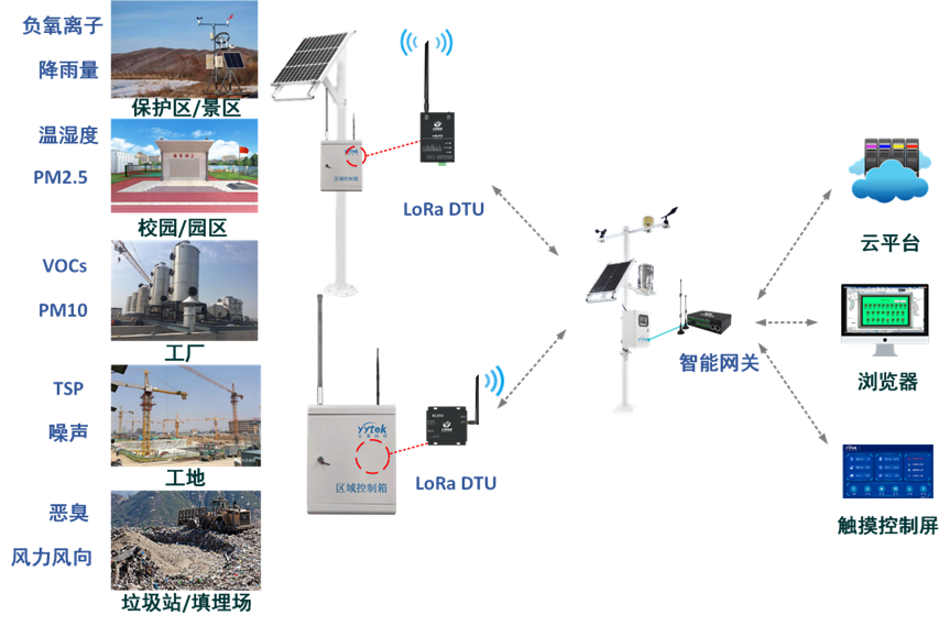 ? ? ? 城市霧霾、工業(yè)廢氣污染、尾氣排放、工地?fù)P塵等,都是國家關(guān)注和治理的對象,對于這些污染源頭,我們通過環(huán)境監(jiān)測系統(tǒng),運用傳感采集設(shè)備、聯(lián)網(wǎng)傳輸設(shè)備、數(shù)據(jù)顯示設(shè)備、邊緣計算設(shè)備等,實現(xiàn)了對pm2.5、pm10等污染物指數(shù)、溫度、濕度、氣壓、噪音、風(fēng)向、風(fēng)速等環(huán)境參數(shù)的采集,并通過物聯(lián)通訊設(shè)備將這些現(xiàn)場的數(shù)據(jù)傳輸?shù)街悄芫W(wǎng)關(guān)或者遠(yuǎn)程服務(wù)器上,便于管理人員及時掌握現(xiàn)場監(jiān)測數(shù)據(jù)。針對蜂窩數(shù)據(jù)信號比較好的地區(qū),我們可以使用 LTE DTU將數(shù)據(jù)直接透傳至平臺,針對偏遠(yuǎn)地帶或者信號受屏蔽地區(qū),我們可以采用LoRa DTU進(jìn)行數(shù)據(jù)采集和中繼傳輸,然后使用智能網(wǎng)關(guān)進(jìn)行數(shù)據(jù)處理和環(huán)保平臺對接。